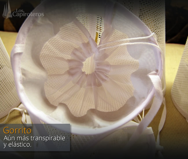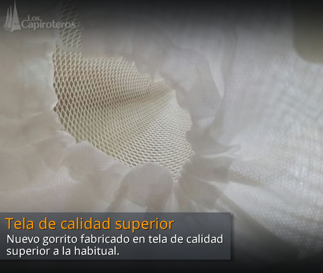 El gorrito se une al capirote mediante un fieltro especial muy ligero y una tela muy fina y elástica, que permite gran transpirabilidad y comodidad para la cabeza.