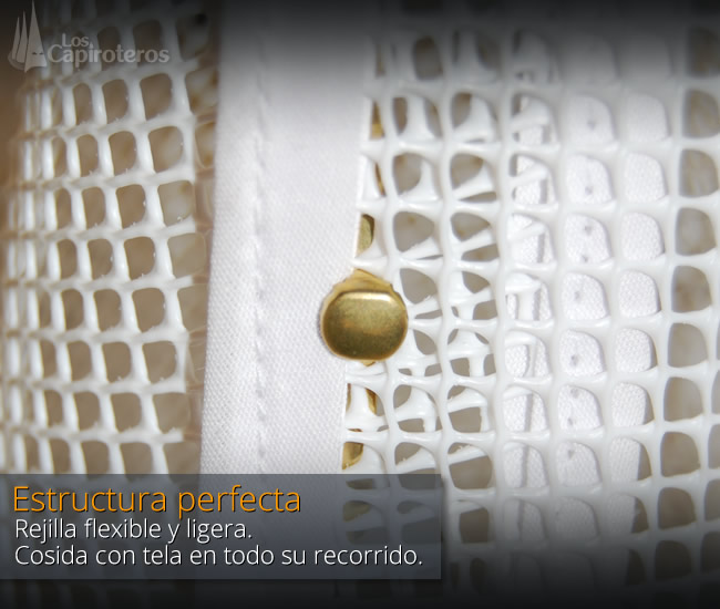 La rejilla que se utiliza, es flexible y ligera, permitiendo que la forma del capirote quede perfecta, y con una punta bastante fina. Los bordes están canteados y cosidos con tela en todo su recorrido. La estructura se sujeta con remaches de metal.
