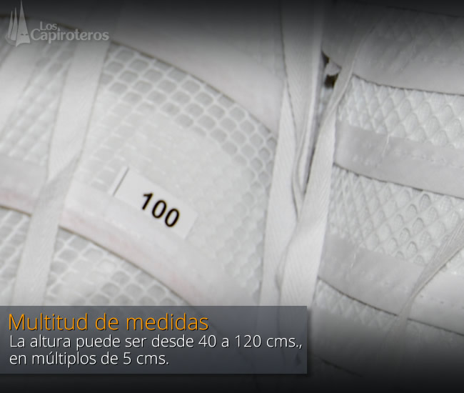 En la base del capirote, se indica la talla con una cartulina pequeña. La altura de los capirotes, puede ser desde 40 a 120 cms., en múltiplos de 5 cms.