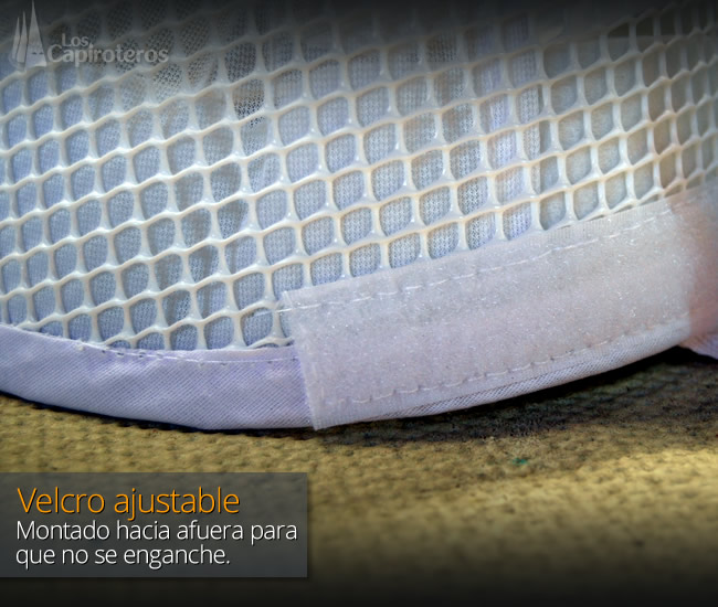 El contorno circular del capirote, está terminado con un velcro muy flexible y ligero, que permite ajustar perfectamente el capirote al diámetro de la cabeza. Está cosido hacia fuera, para evitar el enganche.