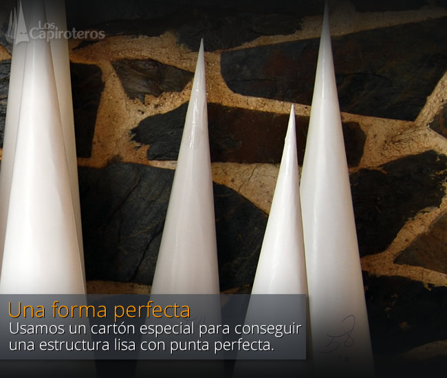 La rejilla que se utiliza, es flexible y ligera, permitiendo que la forma del capirote quede perfecta, y con una punta bastante fina. Los bordes están canteados y cosidos con tela en todo su recorrido. La estructura se sujeta con remaches de metal.